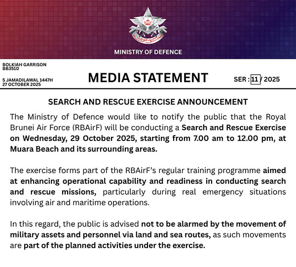 The Ministry of Defence would like to notify the public that the Royal Brunei Air Force (RBAirF) will be conducting a Search and Rescue Exercise on Wednesday, 29 October 2025, starting from 7.00 am to 12.00 pm, at Muara Beach and its surrounding areas.