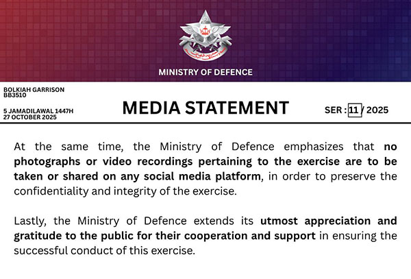 Lastly, the Ministry of Defence extends its utmost appreciation and gratitude to the public for their cooperation and support in ensuring the successful conduct of this exercise.
