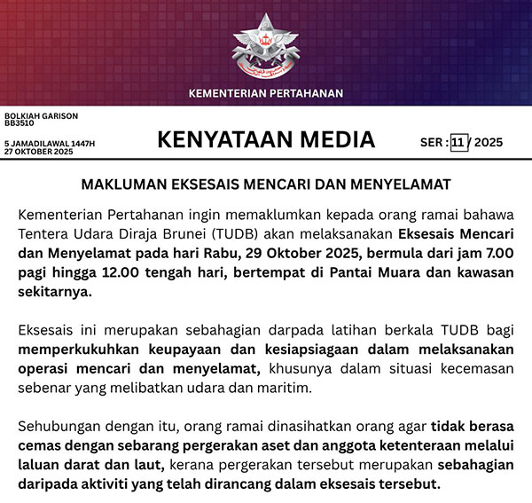 Kementerian Pertahanan ingin memaklumkan kepada orang ramai bahawa Tentera Udara Diraja Brunei (TUDB) akan melaksanakan Eksesais Mencari dan Menyelamat pada hari Rabu, 29 Oktober 2025, bermula dari jam 7.00 pagi hingga 12.00 tengah hari, bertempat di Pantai Muara dan kawasan sekitarnya.