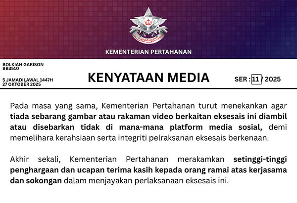 Pada masa yang sama, Kementerian Pertahanan turut menekankan agar tiada sebarang gambar atau rakaman video berkaitan eksesais ini diambil atau disebarkan tidak di mana-mana platform media sosial, demi memelihara kerahsiaan serta integriti perlaksanan eksesais berkenaan.