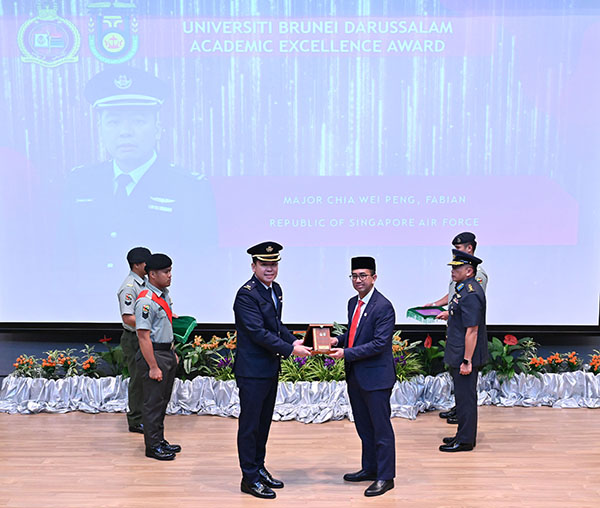A total of four recognition awards were presented to outstanding course participants this year. The Overall Excellence Award was presented to Major Alexander F. Coffiey from the United States of America, while the Academic Excellence Award was presented to Major Chia Wei Peng, Fabian from the Republic of Singapore. Meanwhile, the RBAF Commendation Award was presented to Major (U) Muhammad Adib Bin Haji Hashim from the Royal Brunei Air Force, and the Commandant's Award was presented to Major Pengiran Abdul Rahim Bin Pengiran Haji Yakup from the Defence Academy RBAF.