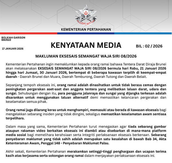 The Ministry of Defence would like to inform the public that the Royal Brunei Land Forces will be conducting EXERCISE SEMANGAT WAJA SERIES 08/2026 from Wednesday, 21 January 2026 to Friday, 30 January 2026, at several selected locations across all four districts - Brunei Muara District, Temburong District, Tutong District and Belait District.
