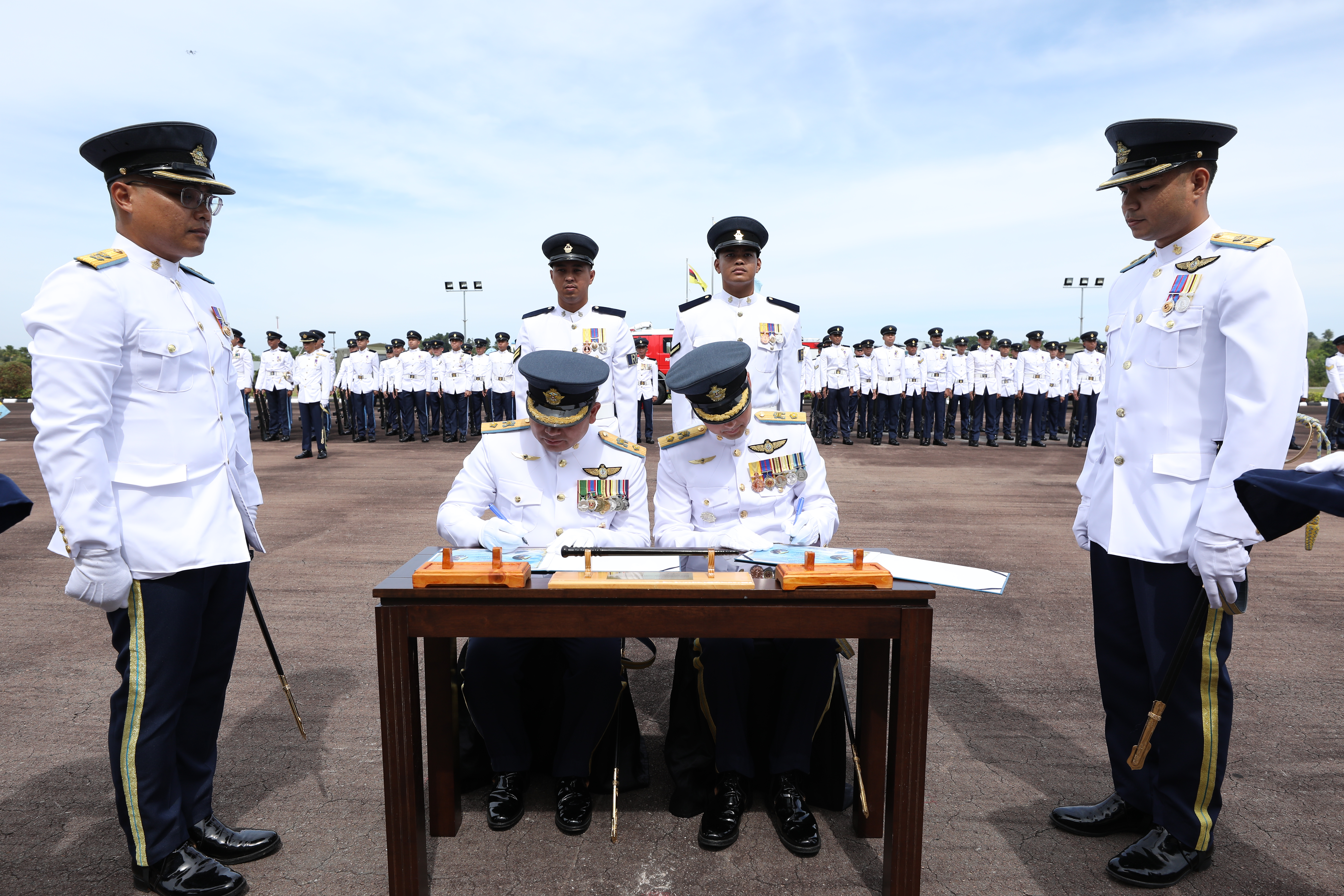 The handover ceremony continued with the signing of the Handover-Takeover Certificate, symbolising the official transfer of command. In his inaugural speech, Lieutenant Colonel (U) Pengiran Mohammad Zulhusmi expressed his honour in assuming the new role and extended his appreciation for the trust placed in him. He reaffirmed his commitment to build upon the solid foundation laid by his predecessor, while encouraging his team to remain steadfast in upholding the RBAirF's mission and operational excellence.