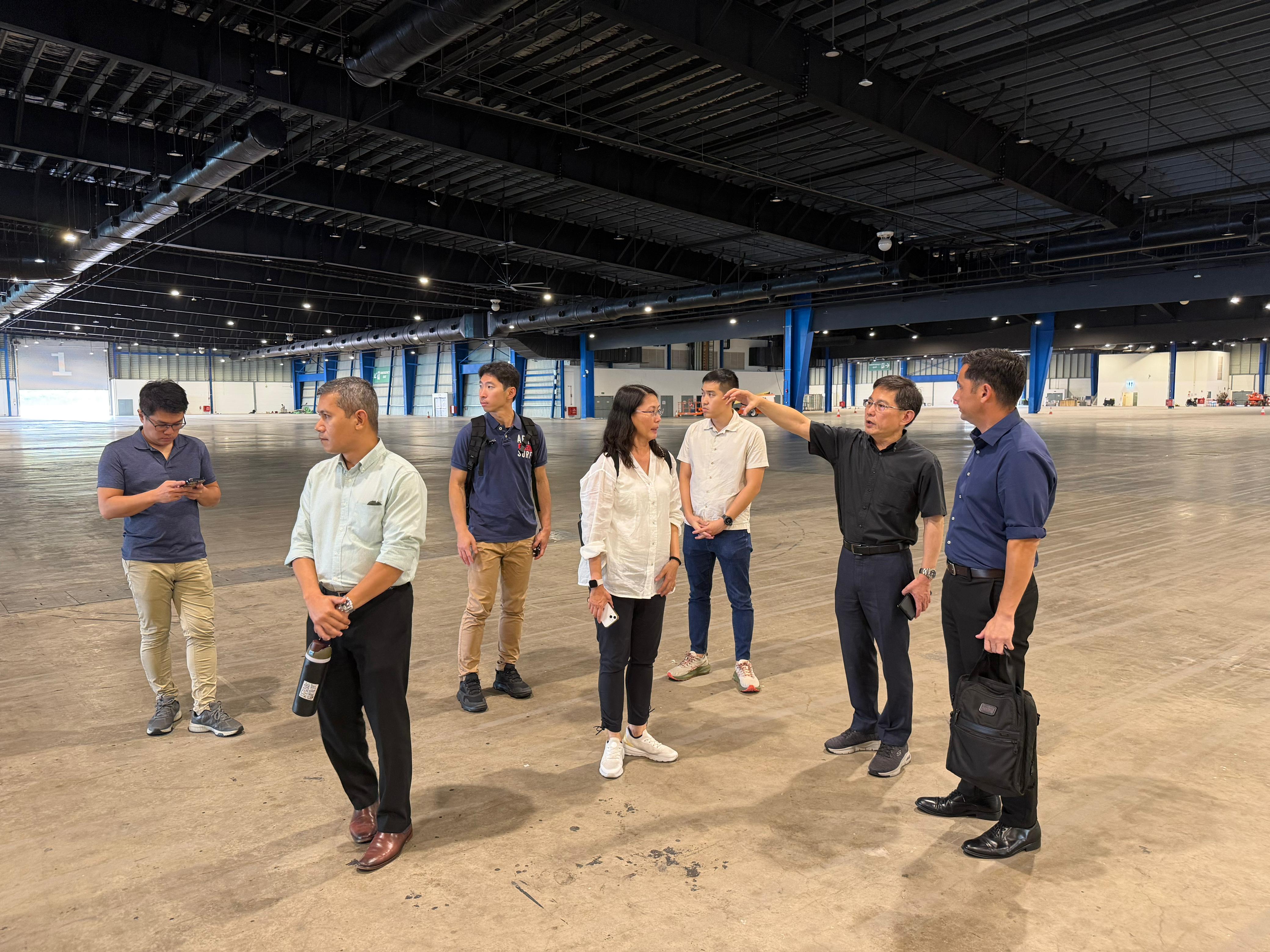 The delegation then attended a session with Experia Events Pte Ltd, hosted by Ms Lee Yang, Director (Exhibitions & Conferences), who provided an in-depth overview of airshow organisation, covering safety planning, risk management, and multi-agency coordination. The itinerary continued with a tour of the Changi Exhibition Centre (CEC), where the delegation was received by Mr Leck Chet Lam, Managing Director of Experia Events. The tour included comprehensive briefings on the venue's infrastructure, the static display layout, and the integrated functions of the operations centre and control tower.