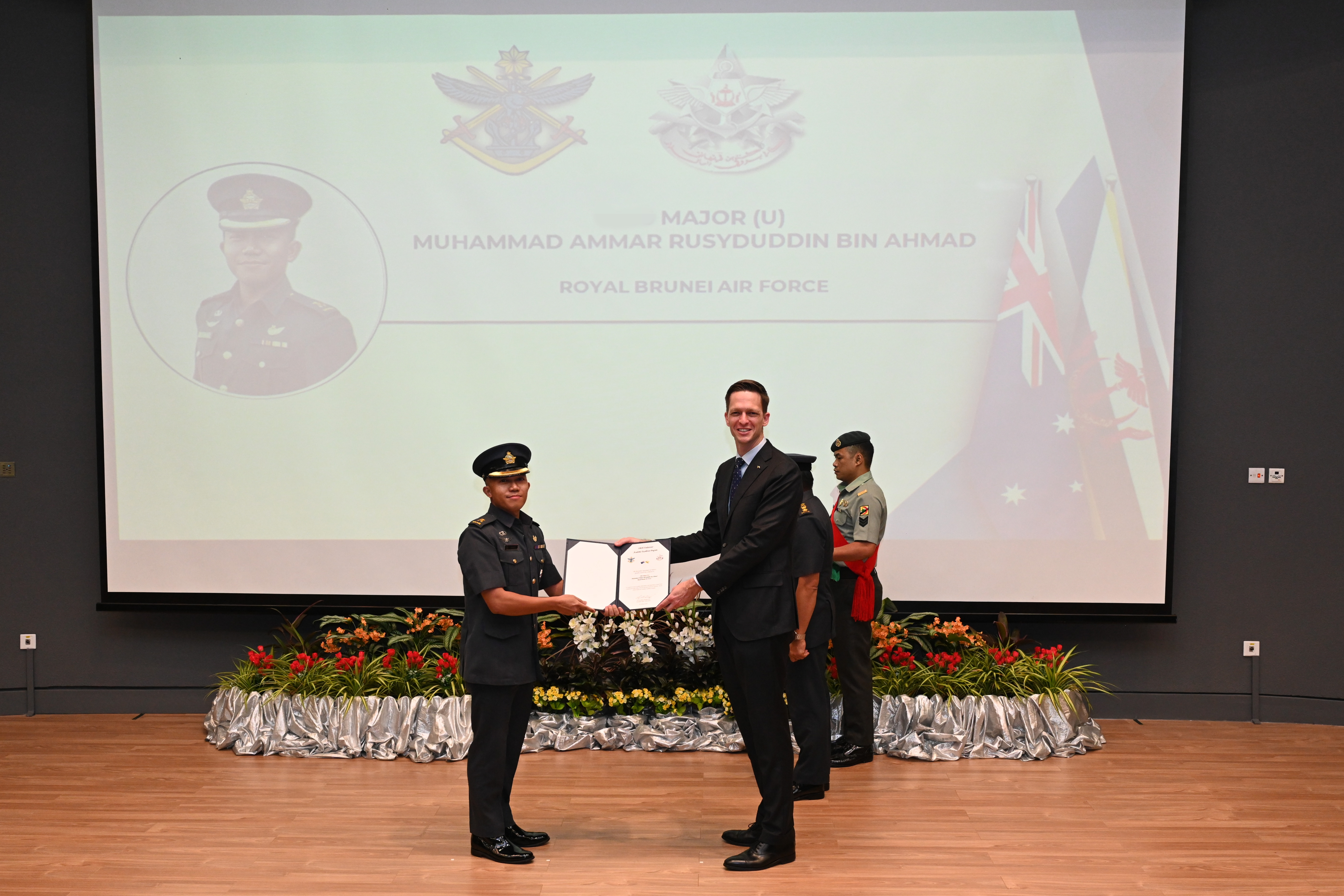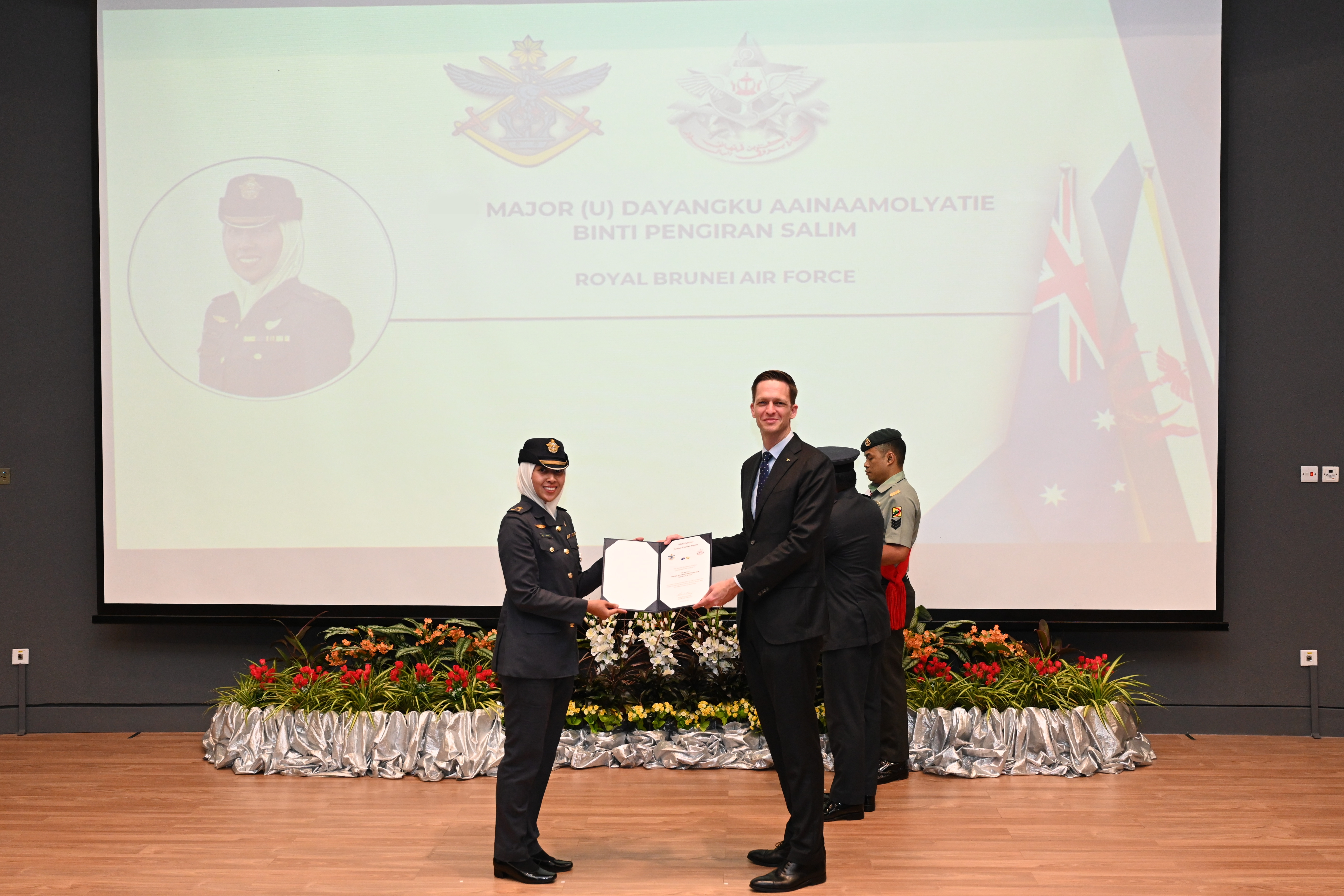 The Guest of Honour, His Excellency Michael Neil Hoy, Australian High Commissioner to Brunei Darussalam, presented the awards to; Major (U) Dayangku Aainaamolyatie binti Pengiran Salim; Major (U) Muhammad Ammar Rusyduddin bin Ahmad; and Major (U) Muhammad Adib bin Haji Hashim (also the recipient of the 15th CSC RBAF Commendation Award).
