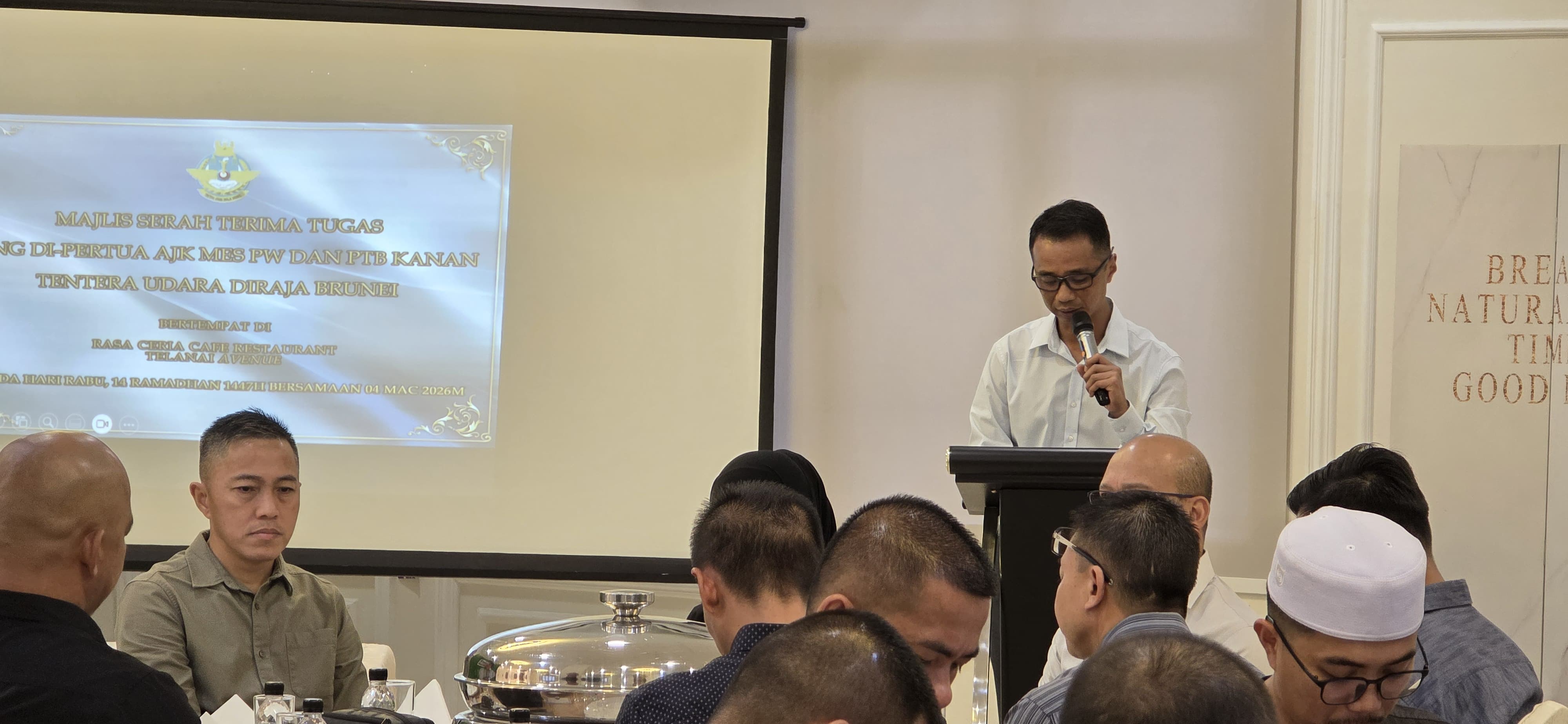TELANAI, Rabu, 04 Mac 2026 – Tentera Udara Diraja Brunei (TUDB) telah mengadakan Majlis Serah Terima Tugas Jawatankuasa Mes Pegawai Waran dan Pegawai Tidak Bertauliah (PTB) Kanan bertempat di sebuah restoran di Telanai hari ini. Hadir selaku Tetamu Kehormat bagi majlis tersebut ialah Pegawai Waran 1 (U) Pengiran Haji Redzaini bin Pengiran Haji Ahmad, Sarjan Mejar TUDB.