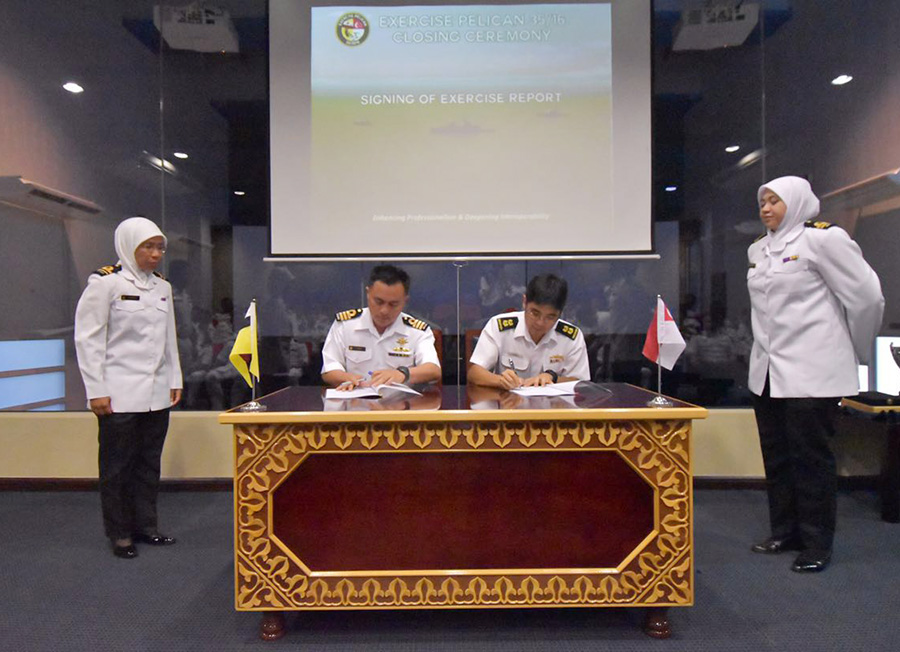 MUARA NAVAL BASE, Wednesday 31 August 2016 – At the closing ceremony today, Exercise PELICAN 35/16 was officially deactivated by Lieutenant Colonel Daniel Ng, Commanding Officer of RSS SUPREME and Deputy Commander Task Group. The bilateral flagship naval exercise between the Royal Brunei Navy (RBN) and the Republic of Singapore Navy (RSN) was held from 24 to 31 August.The Exercise PELICAN 35/16 was showcased to senior defence officials of both countries to mark the 40th anniversary of the defence relations. The exercise has continued to deepen the strong and long-standing relations between the RSN and RBN, and has continued to be the backbone of the professional bilateral interactions between both navies. On the whole, this year’s Exercise PELICAN has significantly boosted the level of interoperability and readiness between both navies.
