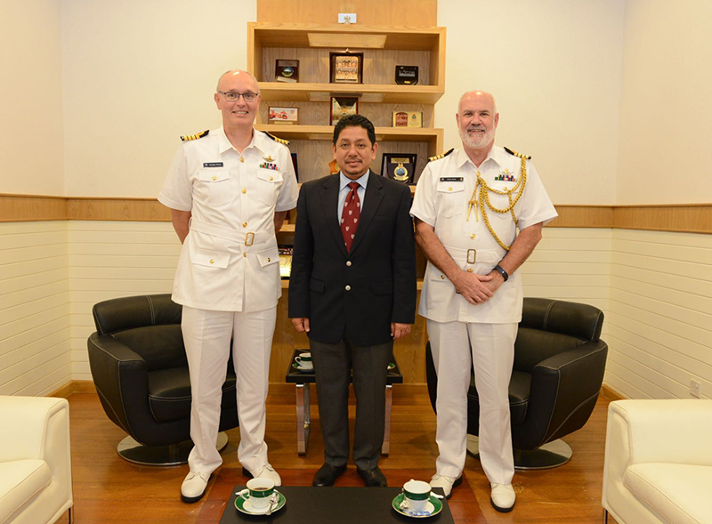 BOLKIAH GARISON, Khamis, 11 Januari 2018 – Kepten (B) Dato Paduka Abd Rahman bin Begawan Mudim Dato Paduka Haji Bakar, TLDB, telah menerima kunjungan hormat pada pagi tadi daripada Kepten Rodger Ward, RNZN, yang merupakan Penasihat Pertahanan New Zealand (tidak menetap) yang diiktiraf ke Brunei Darussalam yang baru, dan juga Kepten Keith Robb, RNZN, yang menamatkan peranan beliau sebagai Penasihat Pertahanan New Zealand.