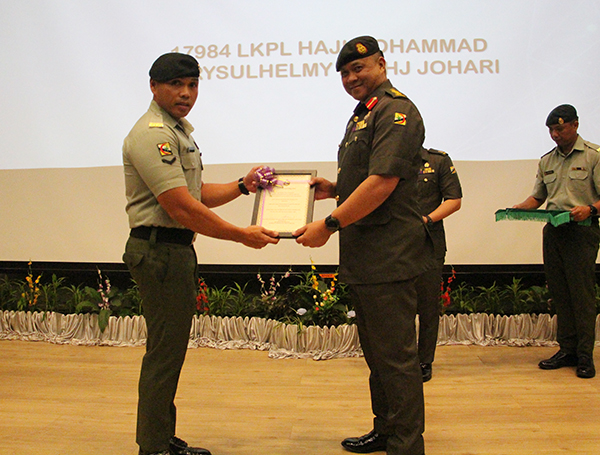 The ceremony continued with the presentation of awards to personnel who had demonstrated excellence in the performance of their duties and made outstanding contributions to the organisation throughout the year. The award in the category of ‘Best Senior Non-Commissioned Officers’ went to Staff Sergeant Noralisham bin Osman, while the award in the category of ‘Best Junior Non-Commissioned Officers’ was presented to Lance Corporal Haji Mohd Harysul Helmy bin Johari.