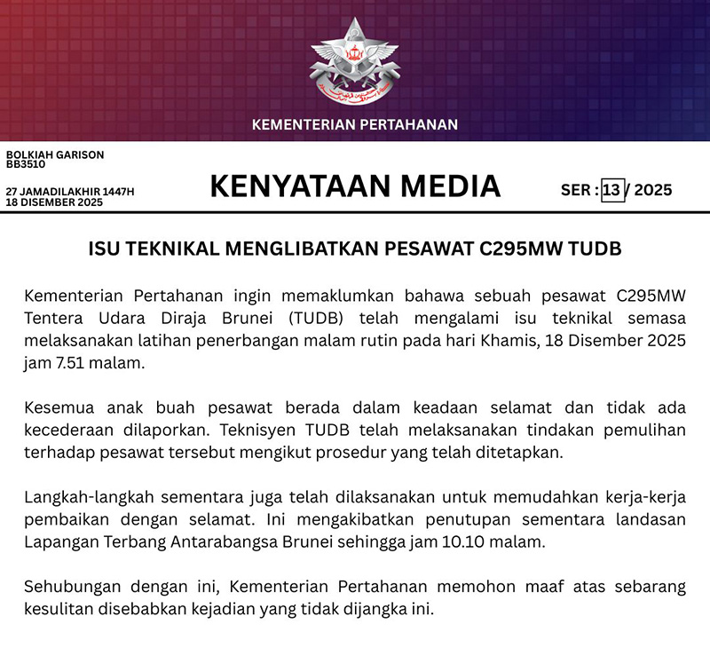 Kementerian Pertahanan ingin memaklumkan bahawa sebuah pesawat C295MW Tentera Udara Diraja Brunei (TUDB) telah mengalami isu teknikal semasa melaksanakan latihan penerbangan malam rutin pada hari Khamis, 18 Disember 2025 jam 7.51 malam.