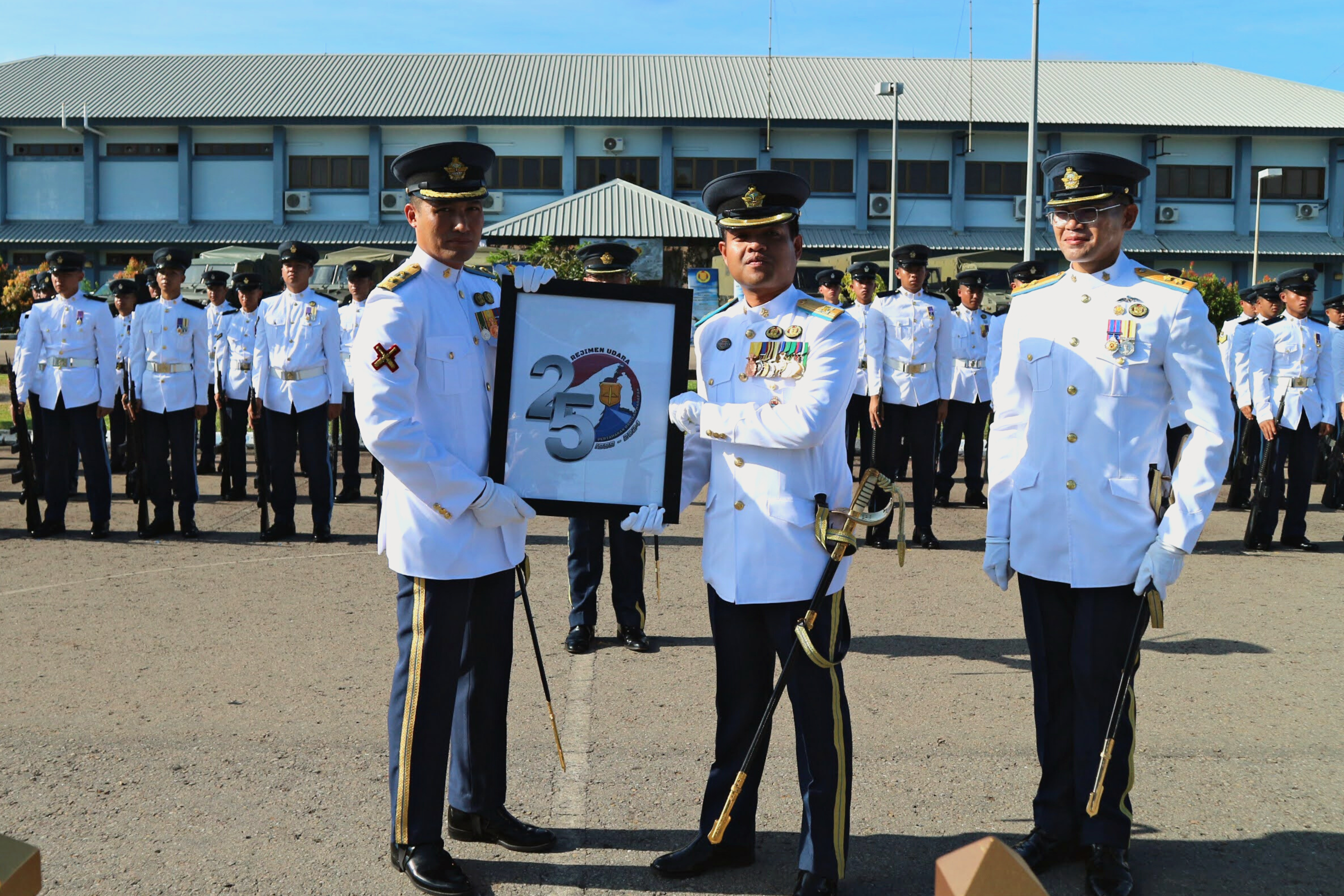 The ceremony progressed to the unveiling of the Silver Jubilee Anniversary Logo, created specifically for this milestone. This emblem features the number "25", signifying the 25 years since the founding of No. 2 Wing. It incorporates symbols of a bayonet and an archer, representing the unit's dual focus on Air and Base Defence, the fundamental elements of No. 2 Wing. Additionally, the logo proudly displays the map of Brunei, demonstrating the nation is safeguarded by No. 2 Wing. The event concluded in a photo session with all attendees.