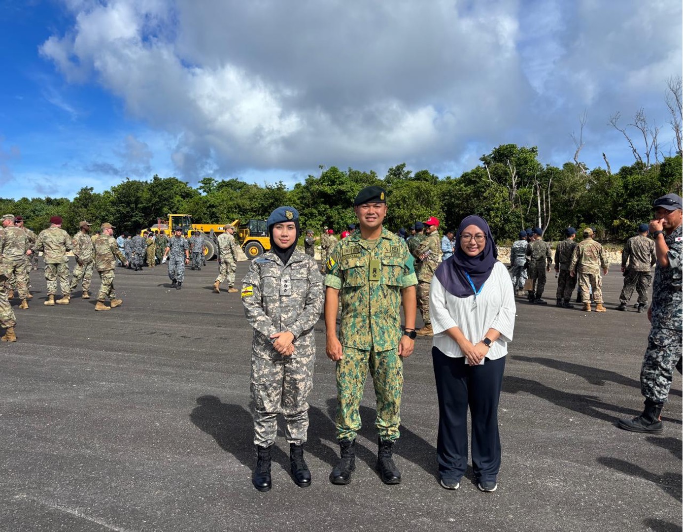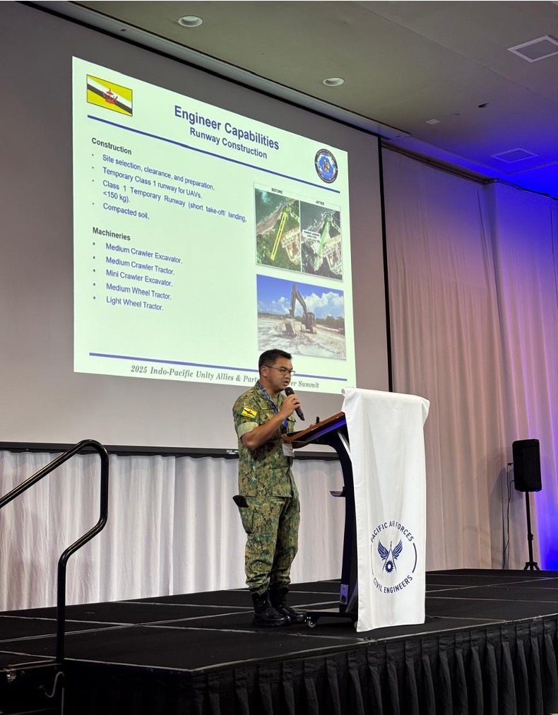 Brunei Darussalam's delegation was led by Lieutenant Colonel Mohammad Ghazali bin Haji Hussin, Commanding Officer, Engineer Regiment, Royal Brunei Land Forces, accompanied by Captain (U) Dk Nur'ul Hayatul Rashidah binti Pg Johari from the Royal Brunei Air Force and Dk Nur Syazwani binti Pg Haji Kamarulzaman from the Directorate of Development and Work Services.