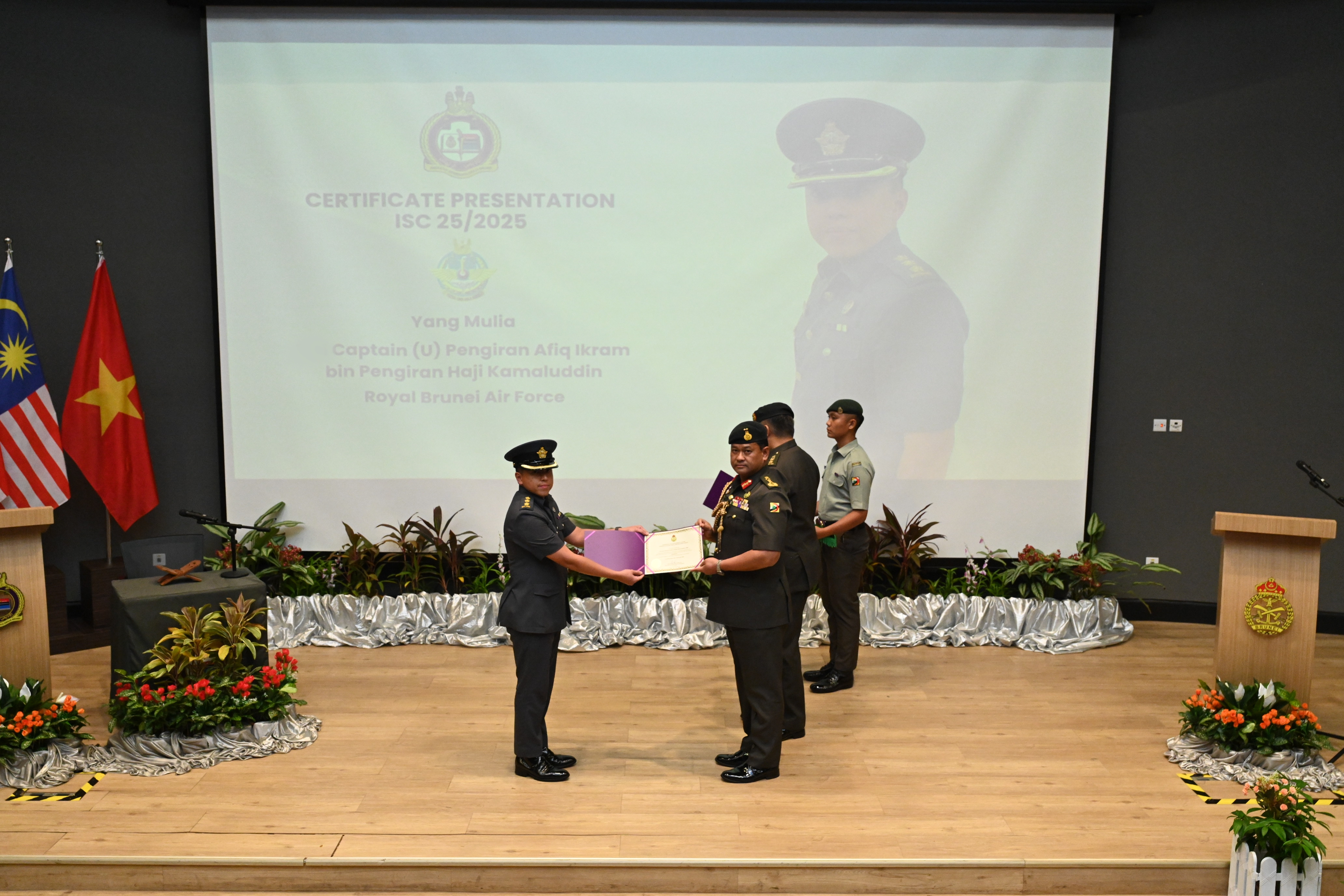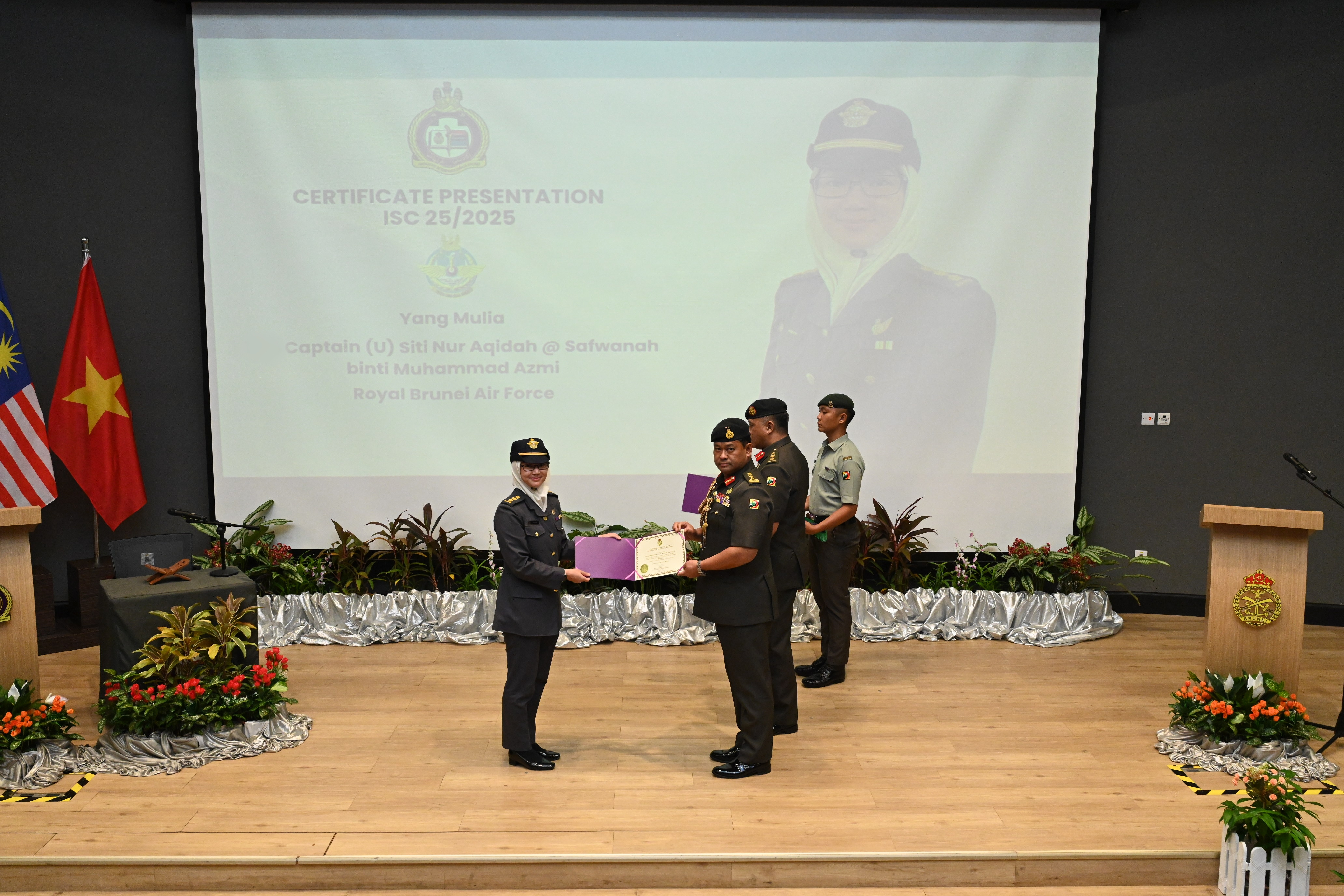 TANAH JAMBU, Thursday, 02 October 2025 – A total of 14 officers from the Royal Brunei Air Force (RBAirF) have successfully completed the Intermediate Staff Course (ISC) 25/2025 held at the Defence Academy, Royal Brunei Armed Forces (DA RBAF), Kampung Tanah Jambu. The course ran for 14 weeks and aimed to develop future leaders capable of operating in complex joint environments.