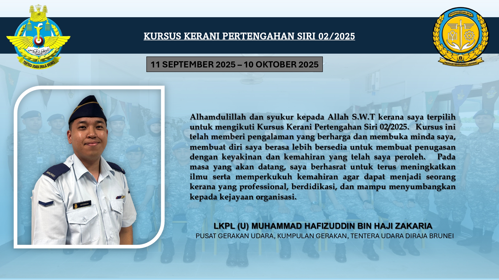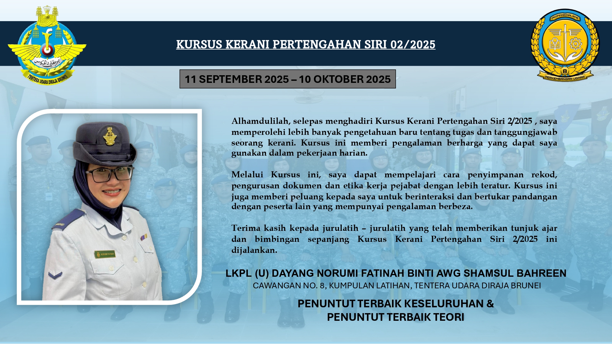 Seramai 15 orang peserta dari pelbagai unit Tentera Udara Diraja Brunei (TUDB) telah menghadiri kursus yang diadakan dari 11 September hingga 10 Oktober 2025. Kursus ini bertujuan untuk melengkapkan anggota dengan kemahiran pertengahan pentadbiran dan perkeranian, selaras dengan piawaian serta protokol Angkatan Bersenjata Diraja Brunei (ABDB).