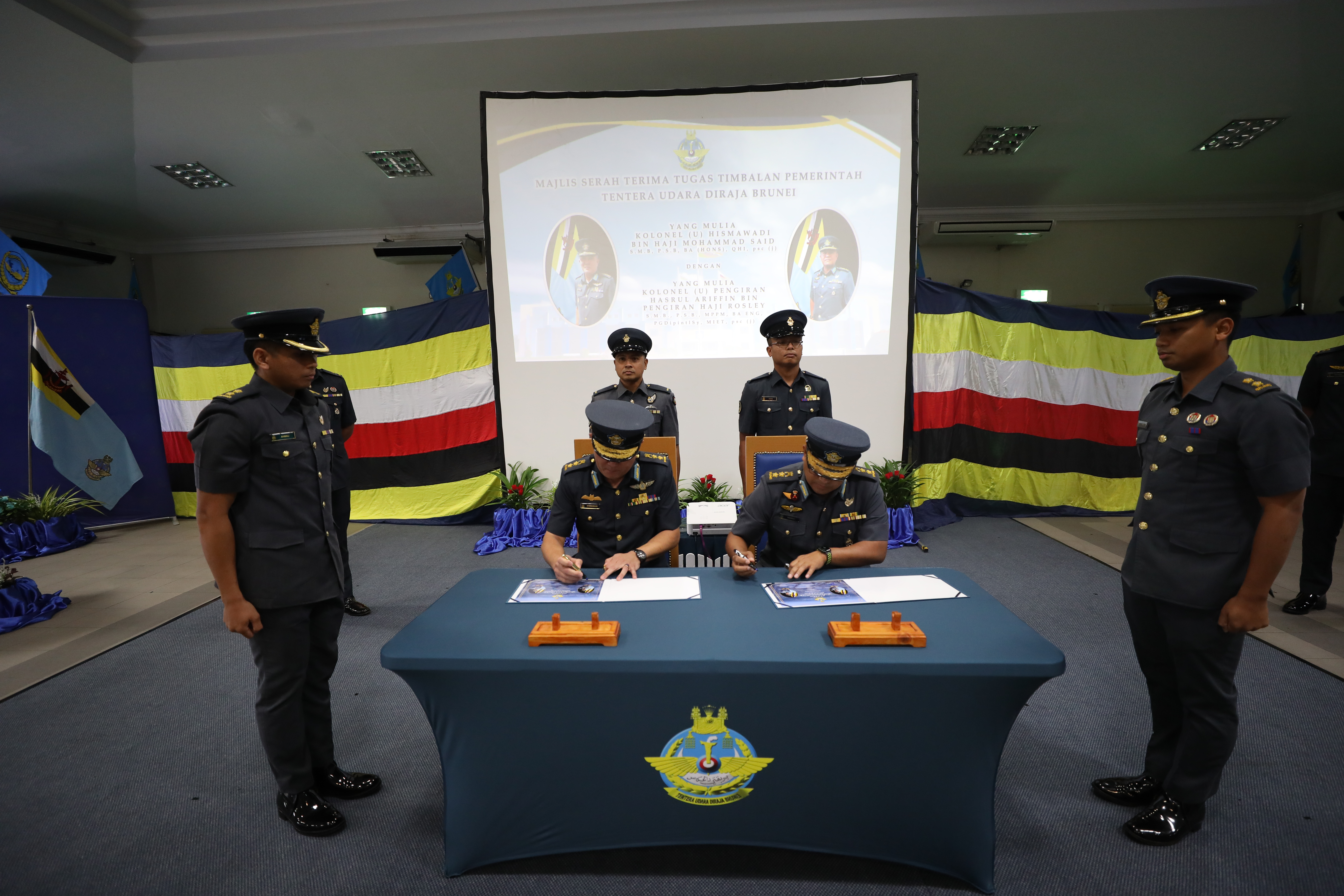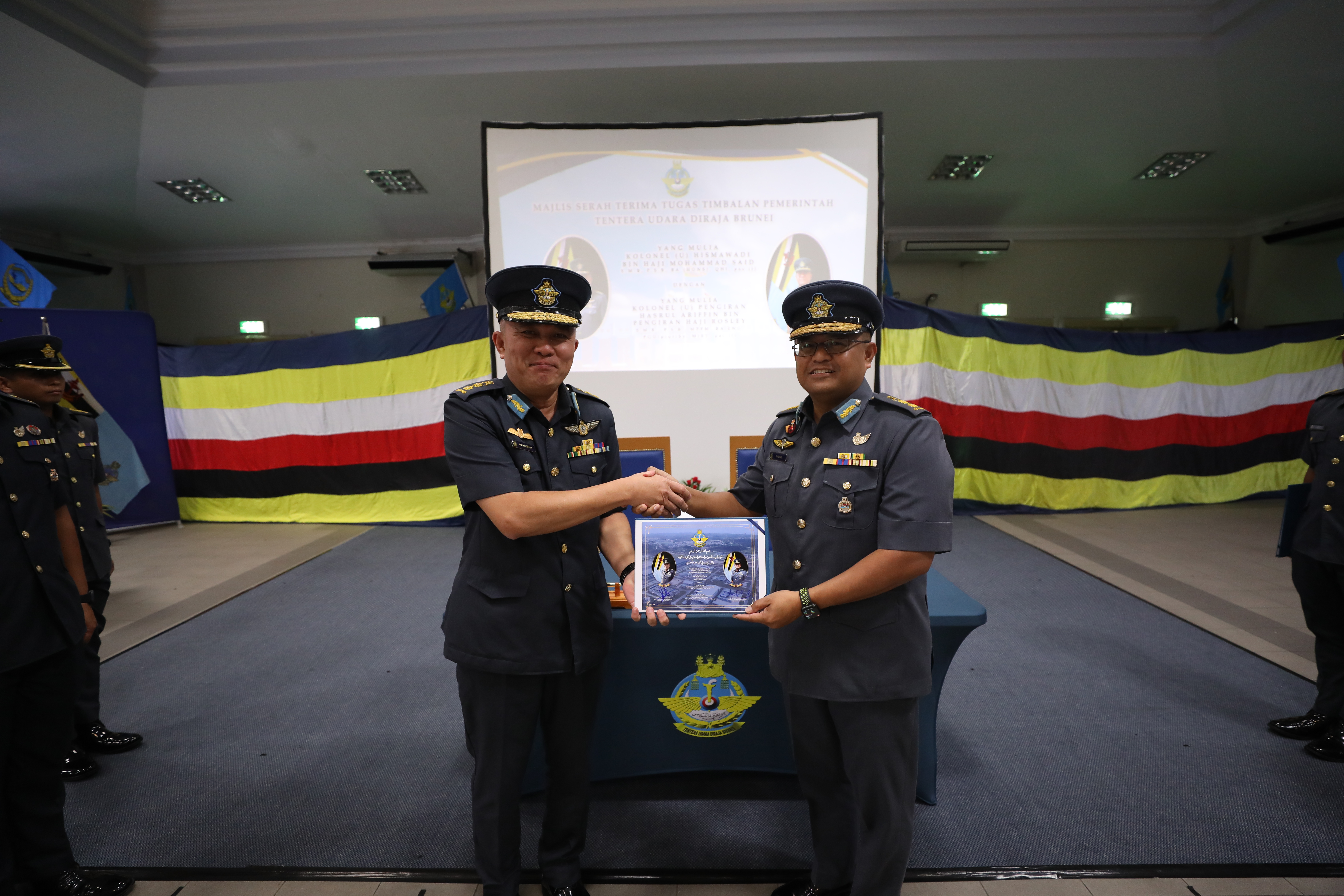 PANGKALAN TENTERA UDARA RIMBA, Khamis, 20 November 2025 – Tentera Udara Diraja Brunei (TUDB) telah mengadakan Majlis Serah Terima Tugas bagi jawatan Timbalan Pemerintah TUDB bertempat di Dewan Punai, Pangkalan Tentera Udara Rimba. Majlis tersebut menandakan penyerahan rasmi tugas daripada Kolonel (U) Hismawadi bin Haji Md Said kepada Kolonel (U) Pengiran Hasrul Ariffin bin Pengiran Haji Rosley, berkuat kuasa 20 November 2025.