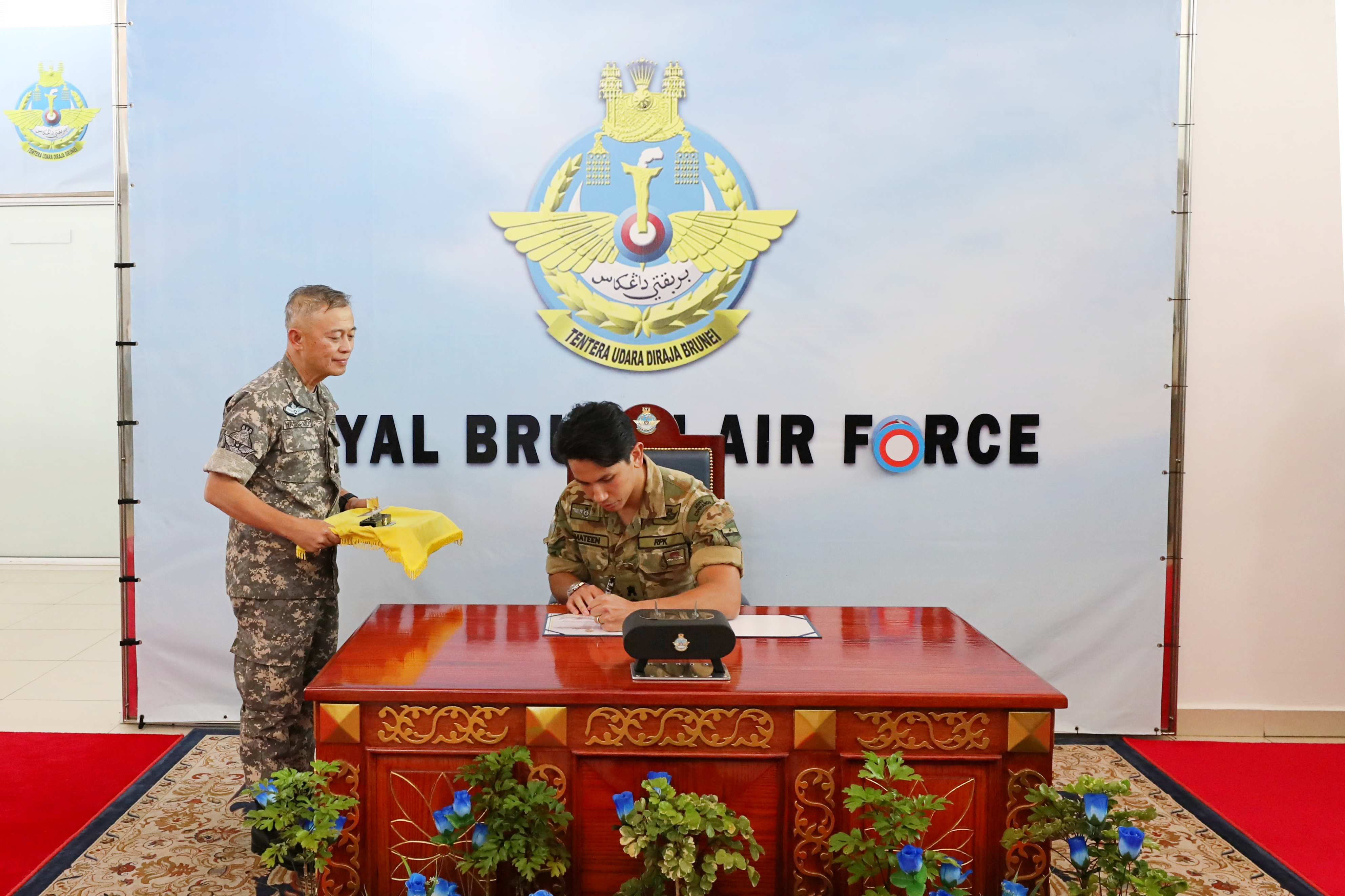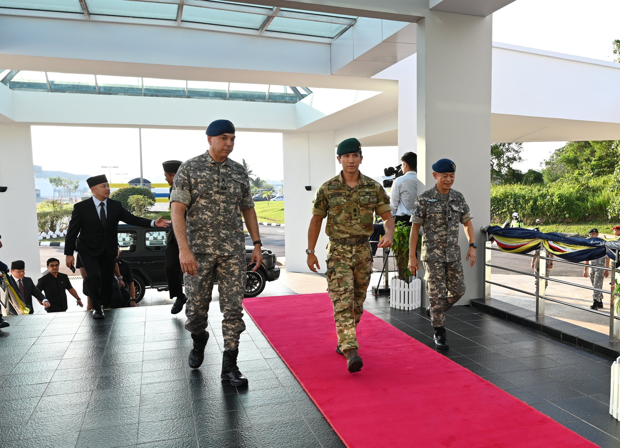 Upon arrival at the Air Movement Centre, His Royal Highness was received by Yang Mulia Brigadier General (Udara) Dato Seri Pahlawan Mohammad Sharif bin Dato Paduka Haji Ibrahim, Acting Commander of the Royal Brunei Armed Forces (RBAF), Yang Mulia Brigadier General (Retired) Dato Seri Pahlawan Haji Alirupendi bin Haji Perudin, Permanent Secretary of the Ministry of Defence and Yang Mulia Brigadier General (Udara) Haji Haszahaidi bin Haji Ahmad Daud, Commander of the RBAirF. Also in attendance were members of the RBAF Executive Committee and Senior officers of the RBAF.